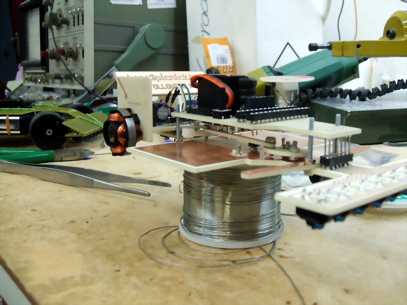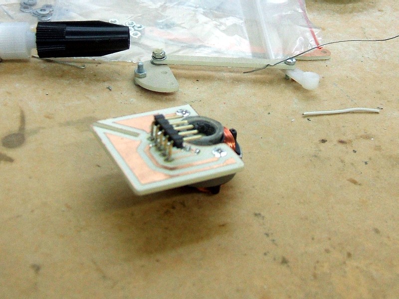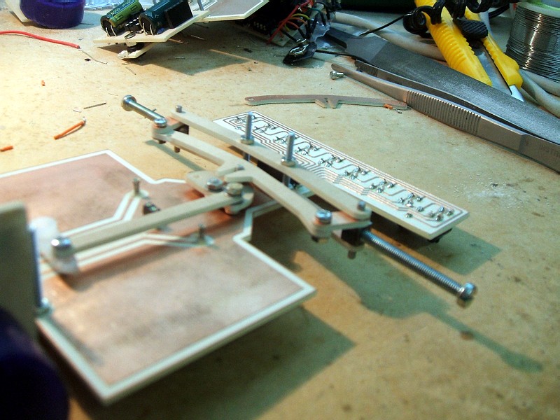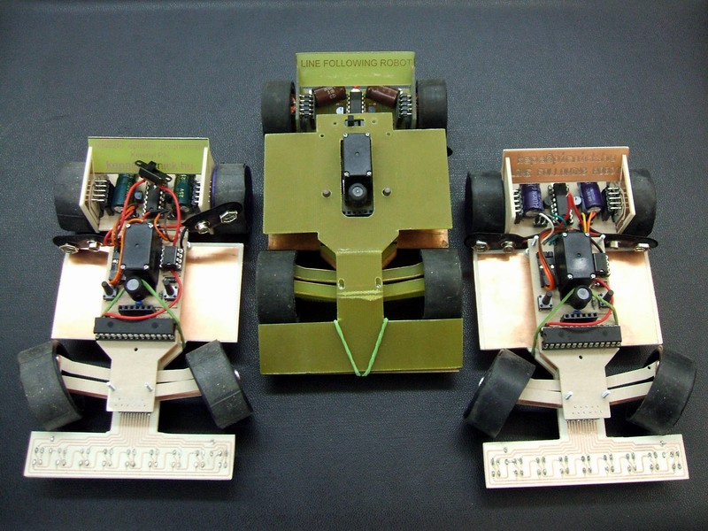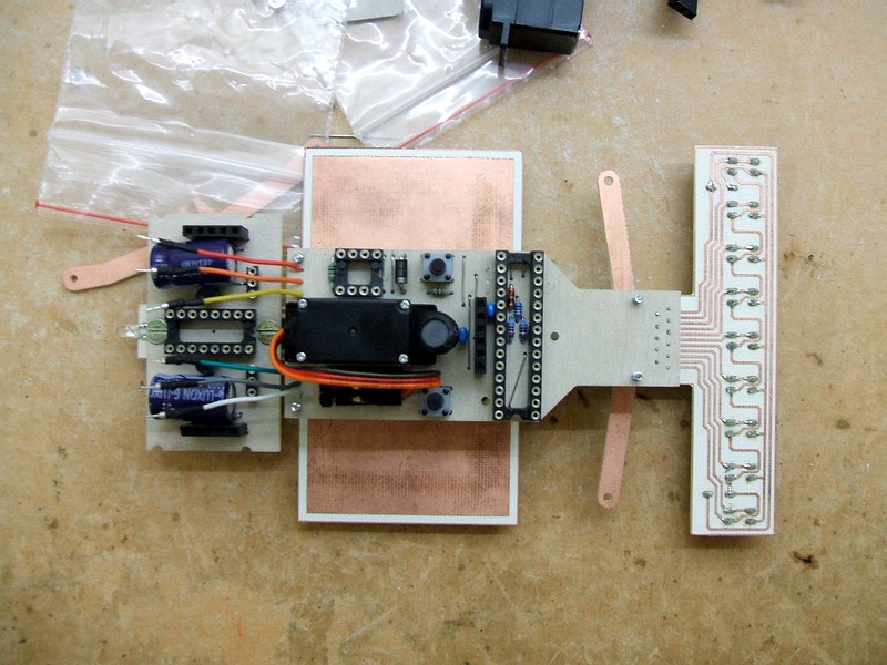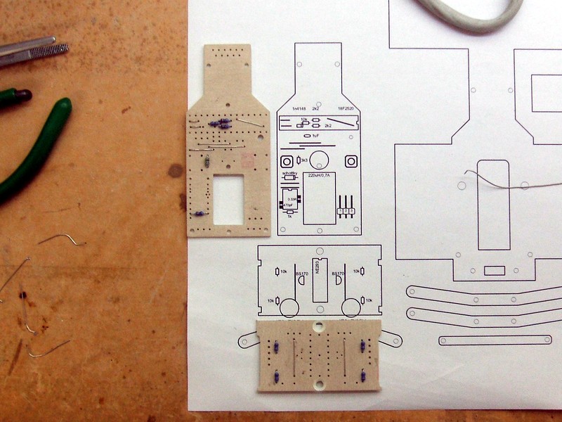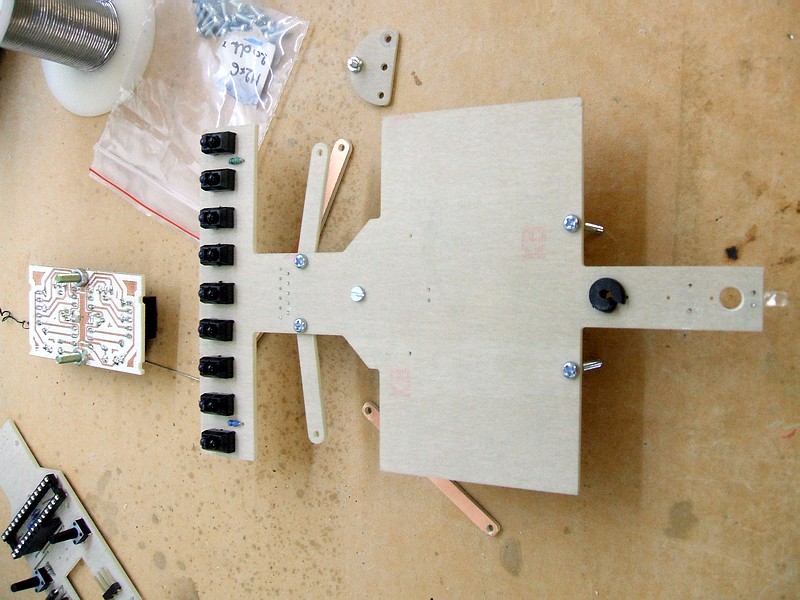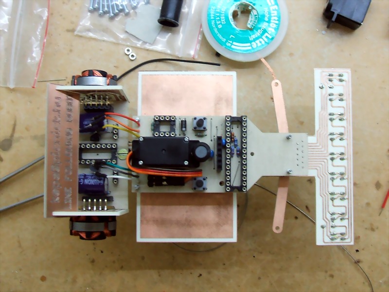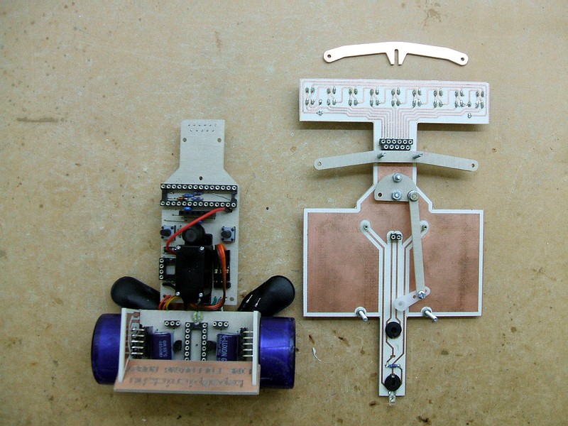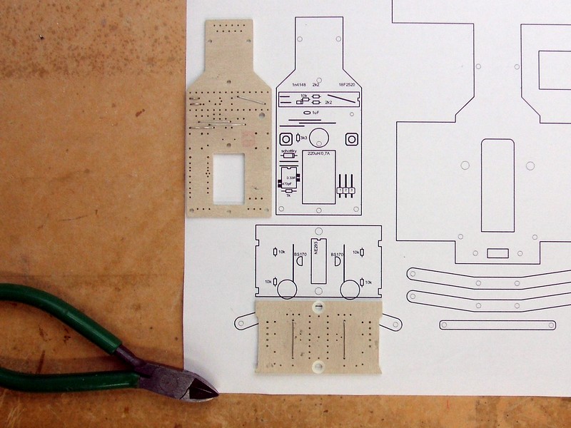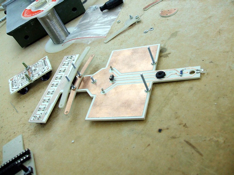 Az első példány foto eljárással készült és kézzel, lemezollóval, fúróval, reszelővel, faragtam ki a NYÁK-ból. Az építés emiatt nagyon sok időbe és fáradtságba került. A képek a második és harmadik robot építéséről készültek amelyek alkatrészeit NYÁK-maró CNC faragta ki.