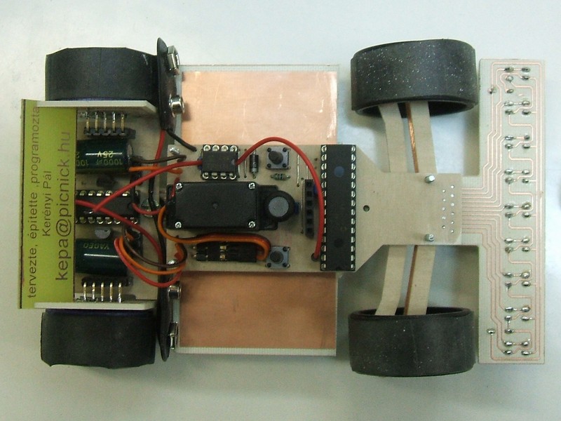A robot agya egy PIC18F2520-as amely, a két energiaforrás között a szervo előtt kapott helyet. Természetesen bármilyen másik lábkompatibilis vezérlővel is működtethető a robot.
