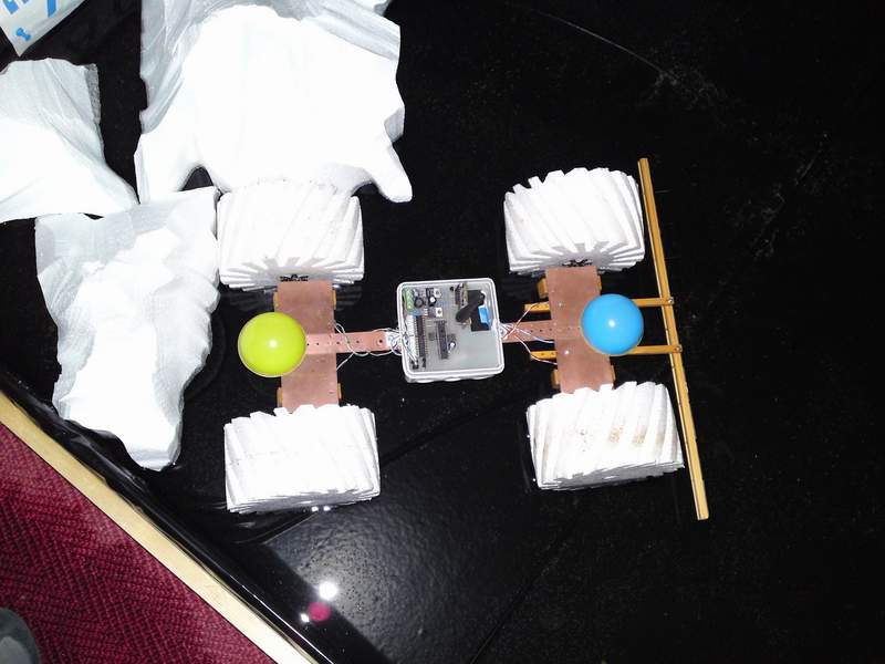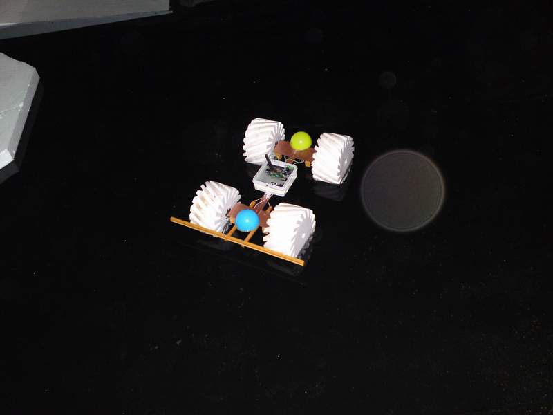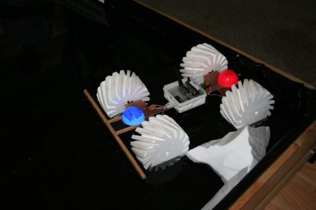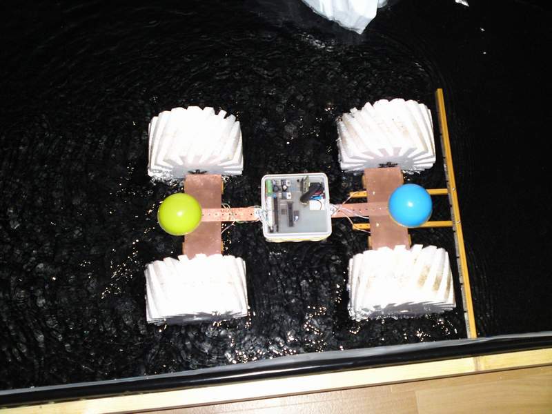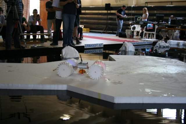 Mint minden más csapat, mi is számba vettük a külön földi és külön vízi meghajtást. Meg is vettük a vízi meghajtáshoz az alkatrészeket és ki is próbáltuk, de súlyuk és áramfelvételük miatt döntöttünk amellett, hogy olyan kereket kell csinálni, ami vízen és szárazföldön, vagyis fagyot vízen is megállja a helyét.