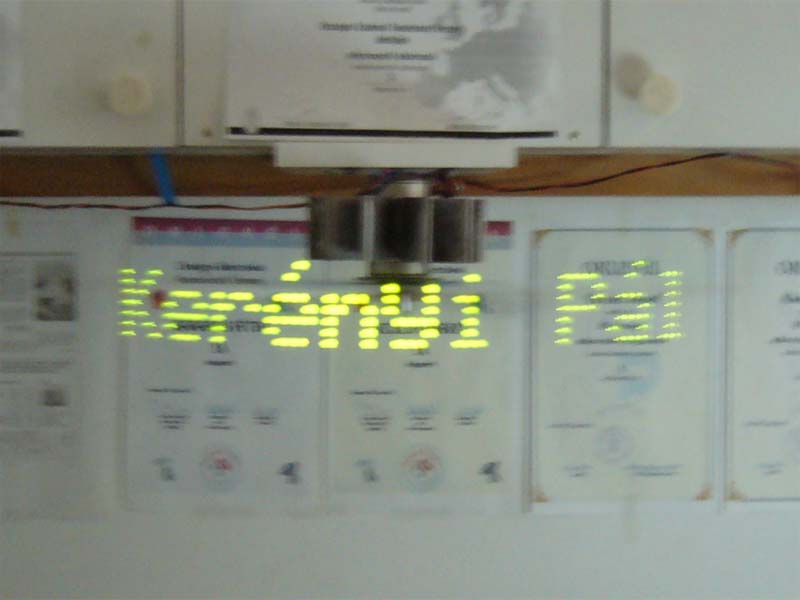 8 LED mechanikai multiplex segítségével ír ki szöveget az eszköz palástjára. Ami csalóka, hogy az eszköznek nincs is palástja és a kép csak a retinánkon létezik. Az eszköz agya egy 16F628-as mikrovezérlő, ami a kijelzést végzi, és a számítógép RS-232-es port-jától fogadja a kiírni kívánt információkat. Az 1. verzió szénkeféken keresztül kapta meg a tápfeszültséget és az adatot. A súrlódás hangja még felpolírozott csúszógyűrűkkel is igen kellemetlen volt, a programfejlesztéshez viszont tökéletesen megfelelt az első modell.