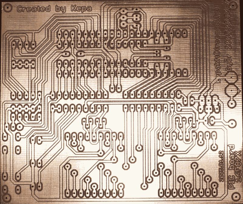 Időközben elkészült az első generációs próbapanel második verziója. Itt beépítésre került az ICSP csatlakózó, így nem kell a PIC-et kiszedni az égetéshez. Ezenkívül a hétszegmenses kijelzőt kicseréltem DC08-11EWA típusra, mert a régi már nem volt beszerezhető! FIGYELEM: a kijelző bekötésének sorrendje megváltozott, az "a" szegmens a PIC RB0-ás lábára került! A nyákterv méretarányos, így a pdf-ből közvetlenül nyomtatható a film!